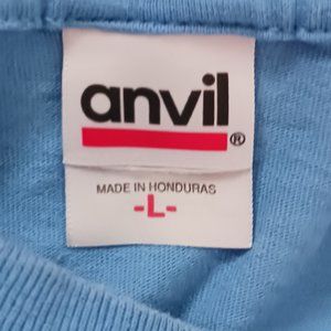 T shirt, Fan the Fire, Tufts University, Medford, MA, Student Athletic Advisory Committee. Anvil base blue tee shirt, 100% cotton, made in Honduras. Tagged as a size L, large. Sizing varies between brands, please note actual measurements: Measuring laying flat. Armpit to armpit =21 inches. Back, measuring down center, not counting the collar band = 26 inches. Pre-owned item in good condition, light crinkling to decal, no holes, no tears, no stains.