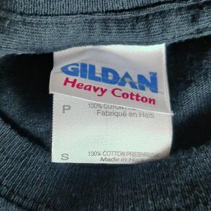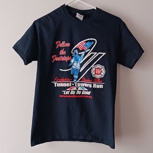 T shirt, Tunnel to Towers 5K Run, charity event memorializing Firefighter Stephen Siller's final footsteps from the foot of the Battery Tunnel to the Twin Towers and those who lost their lives on September 11, 2001. Black Gildan Heavy Cotton t shirt, 100% preshrunk cotton, made in Haiti. Tagged as a Size S, Small. Sizes vary between brands - please note actual measurements. Measuring laying flat. Armpit to armpit = 17.5 inches. Back, down center, not counting collar band = 25 inches. Pre-owned item in good condition, light wear/use, no holes, no tears, no stains.