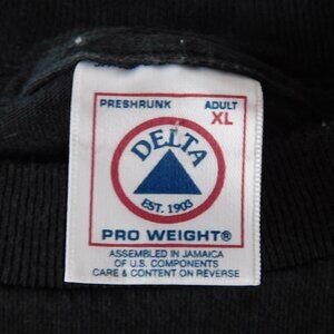 Vintage t-shirt, The Last Shirt 12.31.99, white and red printing on front of black tee, back plain. Delta Pro Weight, 100% cotton, assembled in Jamaica of US components, tagged as a Size XL, Extra Large. Sizing often varies between brands. Please note these actual measurements. Measuring laying flat: Armpit to armpit = 24 inches. Measuring down the center of the back, not counting the collar band = 30 inches. Vintage item, small pin holes at color where price tag was stapled, lightly used, good decal/decoration, no tears, no stains.