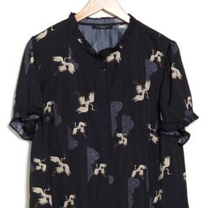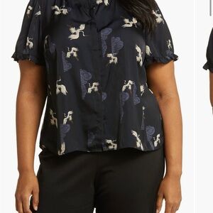 T Tahari, Airflow Ruffle Neck Top, Navy Bird Print, 1X
