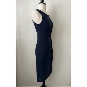 T Tahari Bellini Dress Micro Mesh Side Twist Knot Gathered Faux Wrap Sleeveless Bodycon in True Navy/Navy Blue. Size XS. Lined. Pull-on styling. Last 2 photos are stock photos to show fit and detail only. Good used condition.