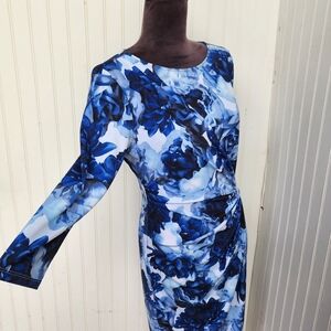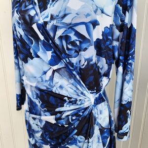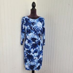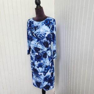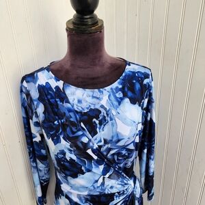 T Tahari Dress Womens 10 Faux Wrap Blue Floral 3/4 Sleeve Knee Length Pullover