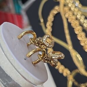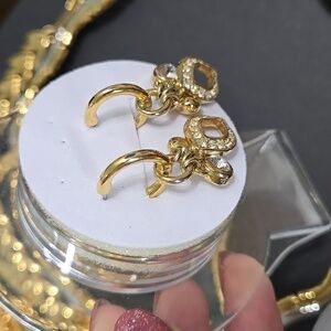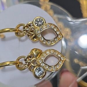 These stunning gold tone earrings feature sparkling crystal/ rhinestones/ Gold-toned puffy heart accents, perfect for adding a touch of elegance to any outfit.