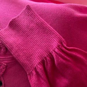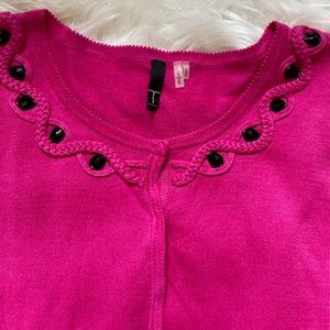 Very soft Fushia pink cardigan has braided trim with black beads around collar line. Hidden snap closure all the way down the front with cuffed long sleeves.