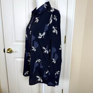 T Tahari Long Sleeve Crane Print Blouse Small/Petite Navy EUC