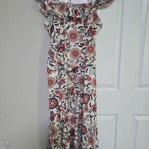 Chic floral midi dress with ruffle sleeves. Vibrant design by T Tahari. Ideal for any event.