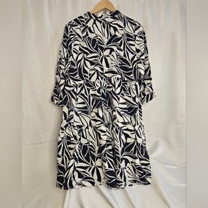 Add a fresh and breezy touch to your wardrobe with this stunning T Tahari dress in a bold navy and white leaf print. Featuring a flattering V-neckline, tiered skirt, and 3/4 sleeves, this relaxed-fit dress is perfect for brunch dates, vacations, or casual office days. Lightweight and effortlessly chic, it pairs beautifully with sandals or wedges. Size Large NWOT