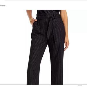 T Tahari Pinstriped Belted Black Pants Size 12 Straight Leg Pockets NWT