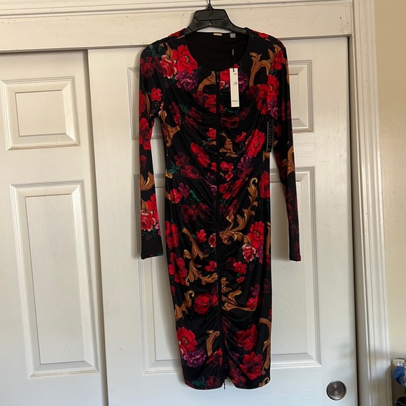 T Tahari floral bodycon dress size small. The dress is lined with black polyester. Zipper runs the whole length of the dress. NWT. 16” Ptp will stretch to 19”