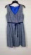Lightweight sleeveless dress in a heathered navy blue fabric that is fully lined in a soft bright blue satin-y fabric. Has tiny solid navy pompoms on neckline and solid navy ribbon at waist, stitched pleat detail on bodice, exposed back zipper. The waist ribbon is stitched to the bodice, so it does not spin around during wear. Simple but elegant with subtle design accents. Perfect for layering with cardigans, sweaters or blazers.