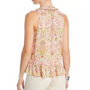 T Tahari Split Neck Ruffle Peplum Top XS Pink Cream Paisley Shirred Sleeveless