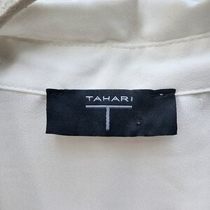 Elegant and timeless T Tahari blouse in size XL. Features a classic white satin-like finish with black contrast piping along the collar, placket, and cuffs for a sophisticated touch. Long sleeves with button cuffs and a slightly relaxed fit perfect for work or evening wear. Front of shirt has lining. Gently worn and in excellent condition.