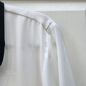 T Tahari, classic blouse, contrast trim, button down, workwear, business casual, minimalist, long sleeve blouse, polished, monochrome, satin feel, XL blouse, white and black blouse