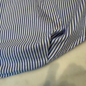 T Tahari, Women’s puffy blouse, cinch pleated at bottom of back hem. Blue & white pinstrip, Size M X 26” Collar to Hem, Structured collar, 61% Cotton, 34% Poly, 5%spandex, Worn long over hips, very breathable fabric