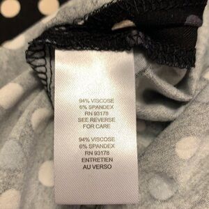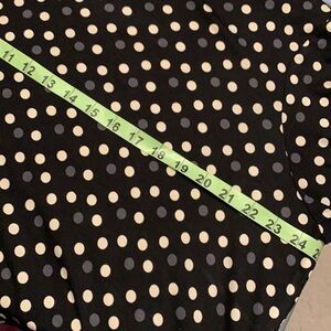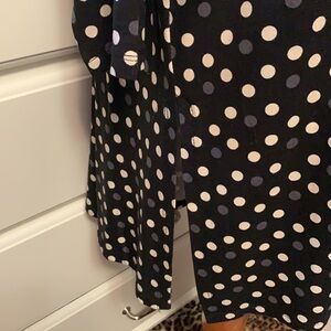 This is a super pretty and super comfortable top by T Tahari. It is a black background with white and gray polkadots on it, three-quarter length sleeves and tunic length with a slit up the side which is about 10 inches long from the bottom. Allows for great freedom of movement and nothing sticking tight to your bottom. It’s a really nice medium weight that can be worn year-round. Wear alone or layer up for several different looks. New with tags.