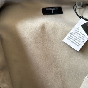 T Tahari light taupe faux leather snap flap chest pockets drawstring hem bomber jacket. Snap cuffs. Hidden front zipper closure under snap flap. Pointed collar. 100% polyurethane. Lining 100% polyester. NWT. Size large. Nonsmoking home.
