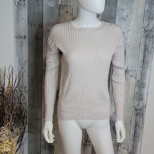 T Tahari Boat Neck Ribbed Sweater in Pale Sand. Stock photo showing it more pink actual color is Pale Sand. There is 2 little dots on the right sleeve that will probably come of with wash