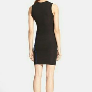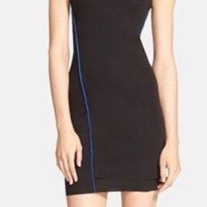 Curvilinear threaded piping streaks across a curve-highlighting jersey dress with a single strand of brilliant cobalt. Allover ruching eases the body-conscious fit, while a side-layered hem enhances the contemporary look.