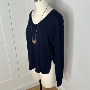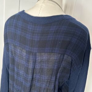 Casual, cool deep navy blue v-neck sweater with sheer plaid back. Front of the sweater is shorter than the back. Great if you want to dress up some leggings.