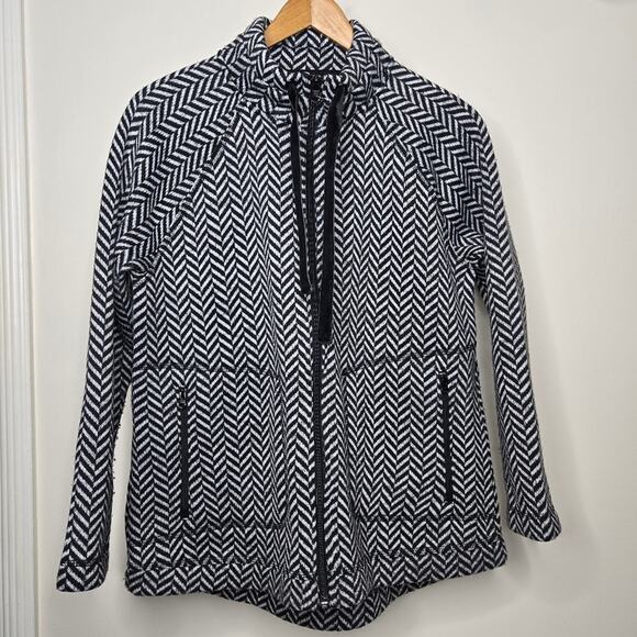 Chic chevron knit jacket by Talbots. Features a stylish pattern in black and white. Ideal for layering.