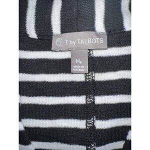 Elevate your wardrobe with the T by Talbots Cardigan, a perfect blend of comfort and style. Available in a petite medium, this black and white striped knit cardigan features a classic open neckline and flattering 3/4 sleeves. It's crafted from a soft mix of cotton, modal, and spandex, ensuring both breathability and a gentle stretch for a seamless fit.