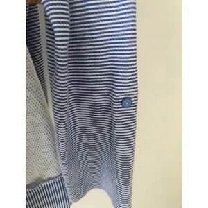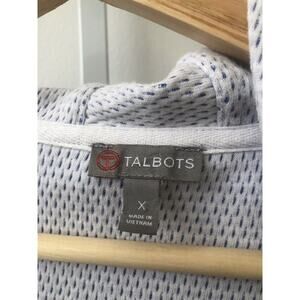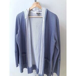 Description: Open front hooded cardigan from Talbots. Hooded, long roll-tab sleeves, open front, hip length, front pocket. Soft, lightweight textured knit in a blue and white stripe.