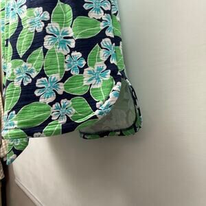 T by Talbots Blue Green Hawaiian Print Dress Tie Waist Navy Trimmed Caged Back