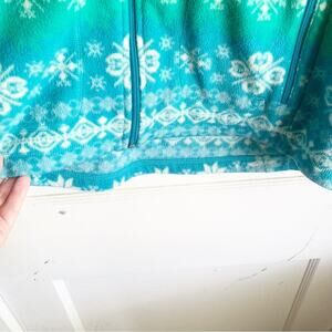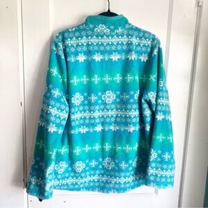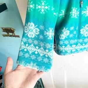 T by Talbots Colorful Snowflake Zip Front Long Sleeve Fleece Jacket Size XL. Blue and green. Funnel neck. A little longer in back than front. Two front zippered pockets {functioning}. Good, preowned condition. Some normal fuzziness from normal wash wear. 100% polyester.