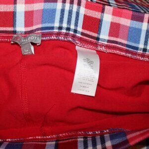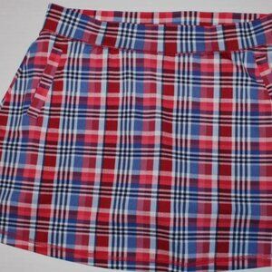T by Talbots red, blue, black and white plaid skort (cotton short lining) and 2 pockets. Size large petite, waist is 34" - 38", hip is 38", length is 16". Fabric is 95% polyester, 5% spandex, cotton shorts lining. In good gently worn condition with no damage and only slight signs of wear.