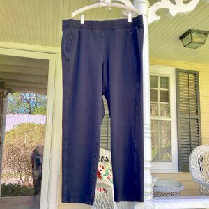 Extremely comfortable, generously cut. Two front pockets, each with invisible zipper. T by Talbots Straight Leg, made of 89% cotton, 11% spandex, a medium-to-heavy weight fabric. Marked size XL (but seems larger—check measurements here). Except for a slight scissor nick at the top of the back waistband (when I cut off original price tags), these pants are in excellent condition. Still sold new on their website.