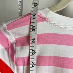 This tee is pure serotonin in shirt form. Featuring candy-colored stripes in pink, red, peach, coral, and white, it’s ready to bring joy to your wardrobe, your iced coffee run, and possibly your entire HOA.