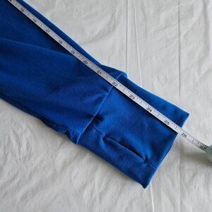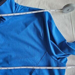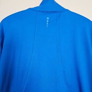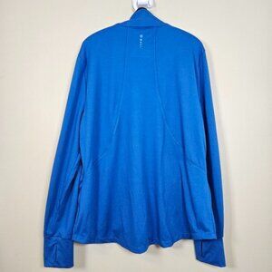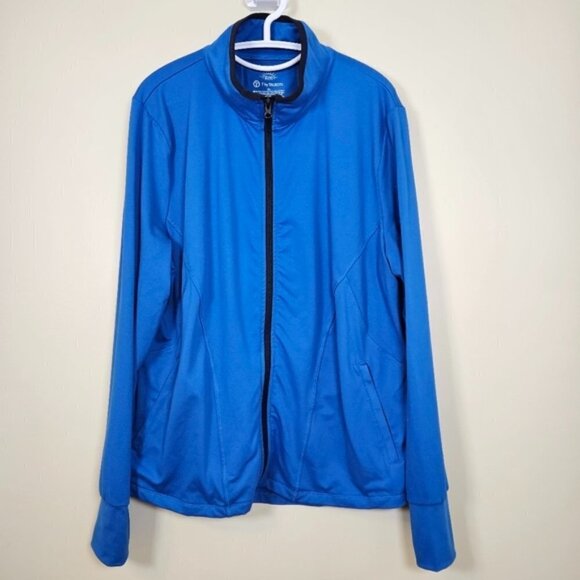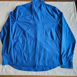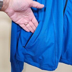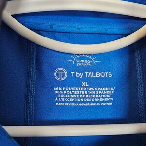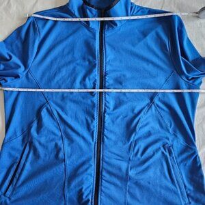 T by Talbots women's full zip long sleeve cobalt blue jacket with reflective logo on back, SPF 50+ protection, side pockets, cuffs with thumbholes