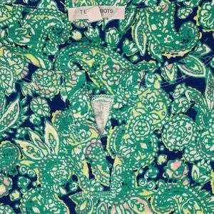 Bright Aqua and royal blue with bits of pink and yellow Paisley and Floral print throughout