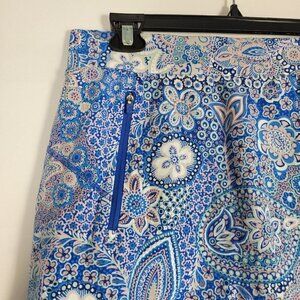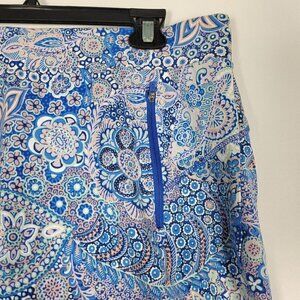 Women's Talbots 95% Cotton and 5% Spandex stretch golf/active skort size L. Vibrant colors and inner shorts are blue. Two zipper front pockets. Approximate not stretched measurements 33" waist and 17.5" length.