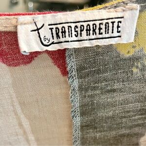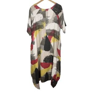 T by Transparente Lagenlook Multi-Color Abstract Print Linen Maxi Dress with Pockets. Handkerchief style hemline. Popover, scoop neck, short sleeve. Made in Italy. Preowned, no flaws.