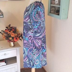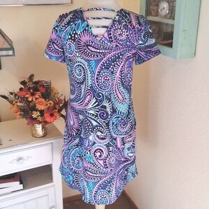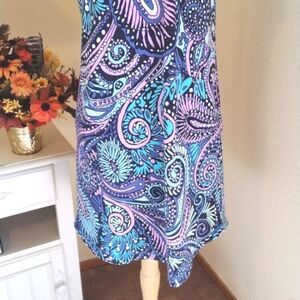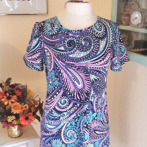 This pretty fabric has an almost French terry back. The outside is super soft knit with bold paisley graphics. Narrow straps on back. Size M measures 37 at chest, 36 at waist, 40 at hips, pockets here. 35 long from shoulder to hem. Pull over. Super comfortable and great looking! Like NEW.