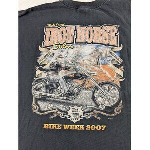T shirt 2XL 2007 Rust In Peace Iron Horse Saloon Bike Week Ormond Beach FL LS . Measures approximately 25" across pit to pit and shoulder down 29". Pre owned in good vintage condition with noted washing to material and some wear also to decal on shirt. For more details please study all pictures.