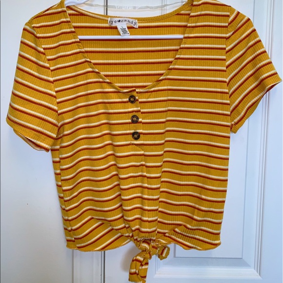 mustard and white stripped t shirt with small brown buttons lining the top. never worn before and is made out of stretchy material.