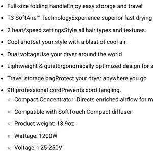 Finally, a travel hair dryer that packs full-size power and features into a smaller, lightweight body. Featherweight Compact makes blowdrying a breeze, whether you take it overseas or across town. The unique folding handle saves space, while T3 SoftAire® technology dries large sections of hair quickly and gently for shiny, frizz-free results that last. View product features