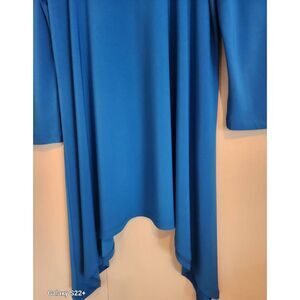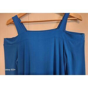 Turquoise cold shoulder flowy blouse. Nice feeling quality material. 3/4 length sleeves with shark tooth hem.