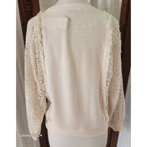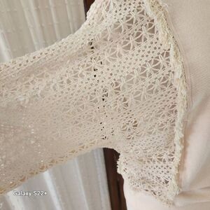 ▪︎DESCRIPTION: Unique style. Long sleeve knit crew neck. Had pretty crocheted sleeves sides. Open weave would need something under it like a sports bra or tank top