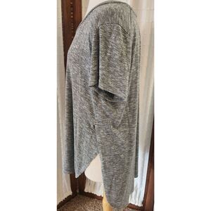 Mossimo long gray heather knit top. This t-shirt features a flattering scoop neck, short sleeves, and a relaxed fit, making it perfect for everyday wear. The rounded split hem adds a unique touch to this versatile top, which is made of a blend of polyester, spandex, and rayon for a soft and stretchy feel. The Mossimo brand ensures quality and style, making this t-shirt a must-have for plus-sized women looking for a chic tunic option in a classic gray color.