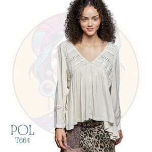 T664 POL Cream Off White Trim Point Ruffle Rayon Top
