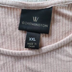 Worthington ribbed knit pink top in size 2XL is a stylish and comfortable addition to any woman's wardrobe. With its unique cut out shoulder detailing and short sleeves, this t-shirt is perfect for those looking for something with a trendy and modern twist. Made from a blend of spandex and rayon, this top offers a flattering fit and a soft feel to the touch. The ribbed knit fabric adds a touch of texture and sophistication, making it versatile enough to be worn for both casual and more dressed-up occasions.
