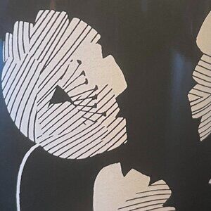 A stunning floral pattern of stylized black and white poppies against an onyx black background wrap around this striking stoneware mug from Tabitha Brown. Cream-colored interior. Large, comfortable four-finger-grasp, cream-colored handle has slots for a spoon. (Spoon not included.) Microwave and dishwasher safe. Measures 4.25” tall with a 3.5” diameter; 5.25” across at the top including the handle. Holds 16 fluid oz.