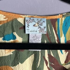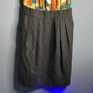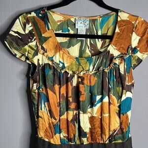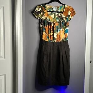 Bodice is yellow and brown floral print. Short cap sleeves and round neckline. Elastic waist with a brown skirt. The dress has pockets.