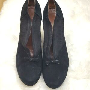In Great Pre-Owned Condition. No Original Box, Minor wear on soles, black suede with stretch fabric mid-foot area, round toe with bow accent at vamp, wedge heel.