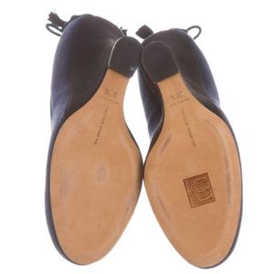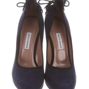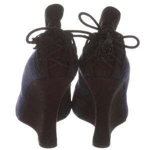 Midnight suede Tabitha Simmons round-toe pumps with black suede trims throughout uppers, lace-up embellishments at counters and covered wedge heels. Includes box and dust bag.