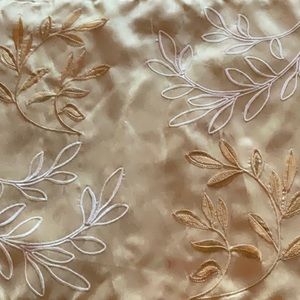 Beautiful embroidered leafs pattern on gold sold fabric.