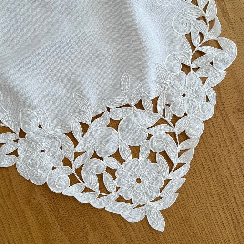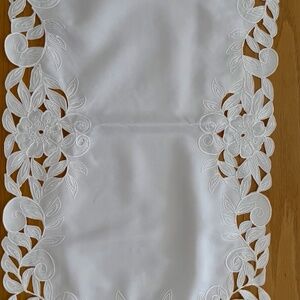 Embroidered, cut out polyester table runner measuring approximately 70 inches x 16 inches. Unused.